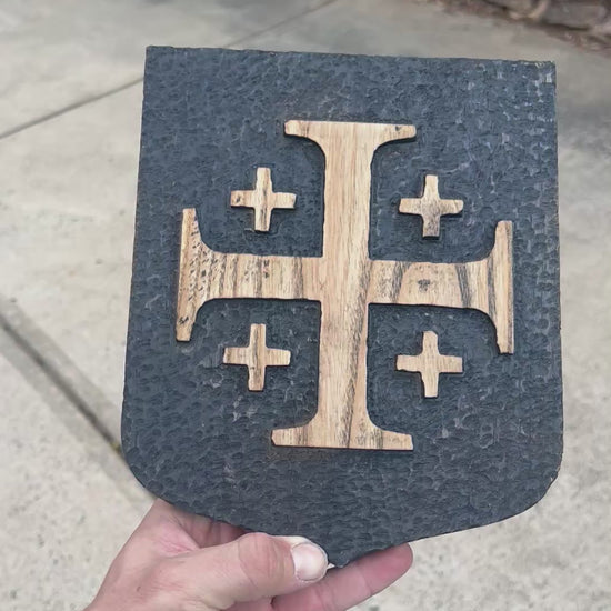 Bring timeless symbolism and craftsmanship into your home with this handcrafted Jerusalem Cross plaque. Made from solid Ash wood, the cross is set against a hand-tooled, blackened background that highlights its natural grain and historic design.