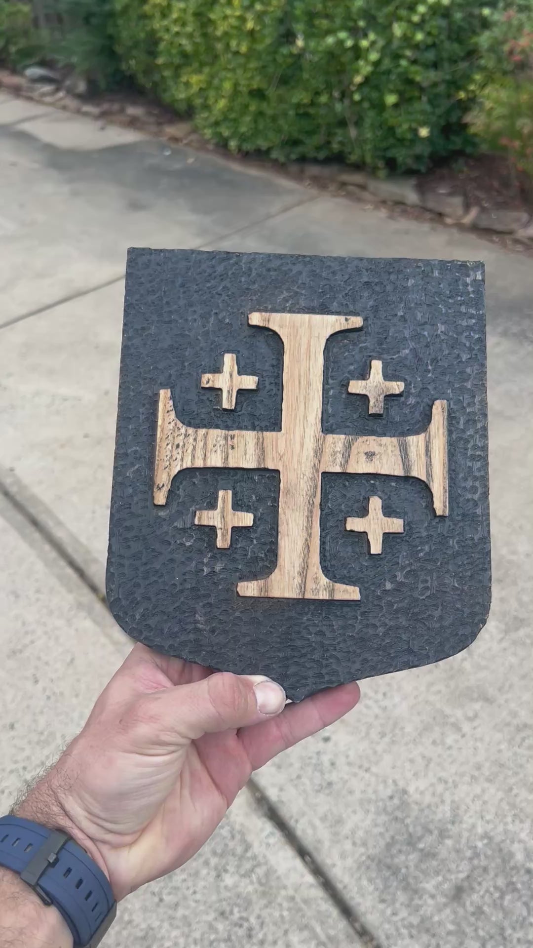 - Jerusalem Cross design in natural wood tones